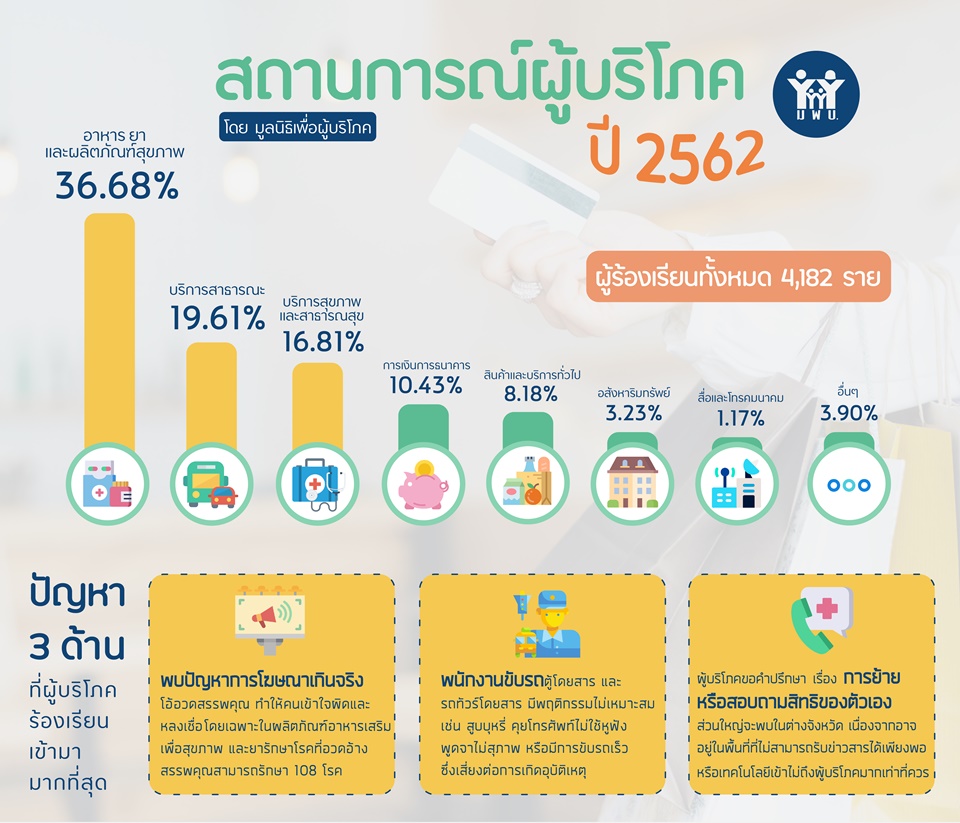 โดยปัญหาด้านอาหาร ยา และผลิตภัณฑ์สุขภาพ ยังเป็นปัญหาที่ผู้บริโภคได้รับผลกระทบและได้ร้องเรียนเข้ามาเป็นอันดับหนึ่ง จำนวน 1,534 ราย คิดเป็นร้อยละ 36.68 รองลงมาคือด้านบริการสาธารณะมีผู้ร้องเรียน 820 ราย และอันดับ3 หมวดบริการสุขภาพและสาธารณสุข มีผู้ร้องเรียน 703 ราย