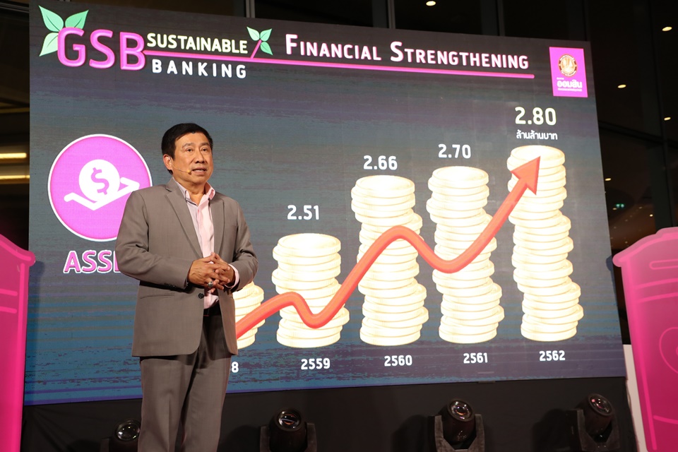 นายชาติชาย พยุหนาวีชัย ผู้อำนวยการธนาคารออมสิน เปิดเผยว่า ปี 2563 ธนาคารมุ่งสู่การเป็นธนาคารเพื่อความยั่งยืน GSB SUSTAINABLE BANKING ขับเคลื่อนผ่านยุทธศาสตร์ 3 ธนาคาร ได้แก่ Traditional Banking Social Development Banking และ Digital Banking โดยตั้งเป้าสินทรัพย์รวมเพิ่มขึ้น 2.9 ล้านล้านบาท หรือ 3.5% พร้อมสนับสนุนการเติบโตทางเศรษฐกิจ โดยให้กู้เพิ่มกว่า 550,000 ล้านบาท หรือเพิ่มขึ้น 4-5% เงินฝากเพิ่มกว่า 75,000 ล้านบาท เติบโต 3% และมีเป้าหมายขยายฐานลูกค้าเพิ่มเป็น 41% ของประชากรทั้งประเทศ หนี้ที่ไม่ก่อให้เกิดรายได้ (เอ็นพีแอล) คาดว่าจะไม่เกิน 3% พร้อมทั้งดูแลคนไทยและสังคมให้มีคุณภาพชีวิตที่ดี