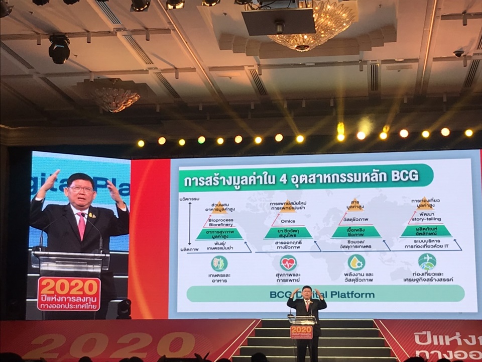 ปัจจุบันเศรษฐกิจ BCG มีมูลค่า 3.4 ล้านล้านบาท สัดส่วนร้อยละ 21 ของจีดีพี จ้างงาน 16.5 ล้านคน ในอีก 5 ปีข้างหน้าตั้งเป้าหมายให้มีมูลค่า 4.4 ล้านล้านบาท สัดส่วนร้อยละ 24 ของจีดีพี เกิดการจ้างงาน 20 ล้านคน เช่น กลุ่มเกษตร ต้องปลูกพืช เลี้ยงสัตว์พรีเมียมชนิดใหม่ ใช้ไอทีส่งเสริมการผลิตแบบแม่นยำ สินค้ามีมาตรฐาน ตรวจสอบได้ ภาคอีสานต้องผลิตโปรตีนทางเลือกจากแมลง ภาคตะวันออกพัฒนาผลไม้ต่อยอดไปสู่อุตสาหกรรม ภาคเหนือสร้างพื้นที่ท่องเที่ยวเชิงสุขภาพเชื่อมโยงวัฒนธรรม ภาคใต้ใช้นวัตกรรมเพาะเลี้ยงสัตว์น้ำ การผลักดันเศรษฐกิจ BCG จึงมีความสำคัญอีกด้านหนึ่ง สอดรับการส่งเสริมอุตสหากรรมเป้าหมายในเขตอีอีซี