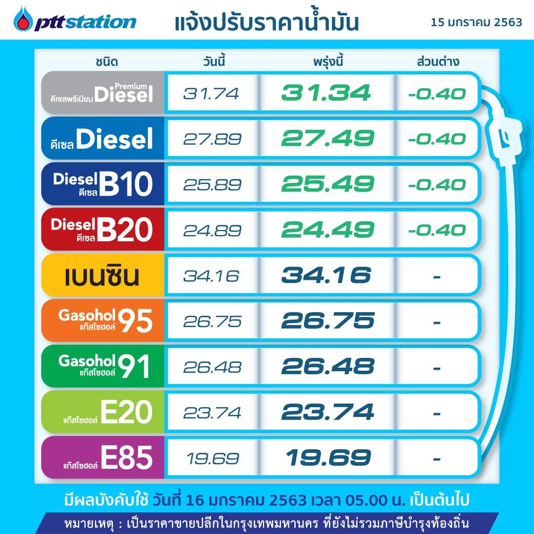 PTT Station บางจากฯ ปรับราคาขายปลีกน้ำมันกลุ่มดีเซลทุกชนิดลดลง 0.30 บาทต่อลิตร ส่วนชนิดอื่นคงเดิม มีผล 16 ม.ค. 2563 เวลา 05.00 น. เป็นต้นไป โดยราคาขายปลีกจะเป็นดังนี้ เบนซิน 34.16 บาท แก๊สโซฮอล์ 95 อยู่ที่ 26.75 บาท E20 อยู่ที่ 23.74 บาท แก๊สโซฮอล์ 91 อยู่ที่ 26.48 บาท E85 อยู่ที่ 19.69 บาท ดีเซล 27.49 บาท ดีเซลพรีเมี่ยม 31.34 บาท B10 อยู่ที่ 25.49 บาท และ B20 อยู่ที่ 24.49 บาทต่อลิตร โดยราคาขายปลีกข้างต้นยังไม่รวมภาษีบำรุงกรุงเทพมหานคร
