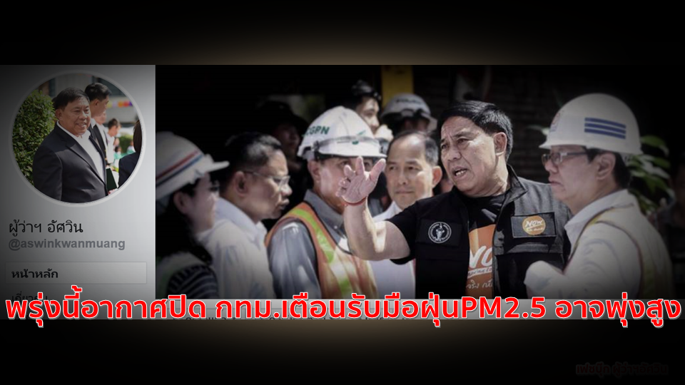 พล.ต.อ.อัศวิน ขวัญเมือง ผู้ว่าราชการกรุงเทพมหานคร (ผู้ว่าฯ กทม.) โพสต์เตือนผ่าน ทางเฟซบุ๊ก ผู้ว่าฯ อัศวิน วันนี้ (15 ม.ค.) โดยระบุว่า กรมควบคุมมลพิษ เตือนว่า16 มกราคมนี้ ค่าฝุ่นอาจพุ่งสูงขึ้น เนื่องจากสภาพอากาศปิดมากที่สุดในรอบเดือนนี้ โดยเฉพาะช่วงเย็นที่การจราจรหนาแน่น ซึ่งจะมีการสะสมของฝุ่นและมลพิษสูงต้องระวังเป็นพิเศษ