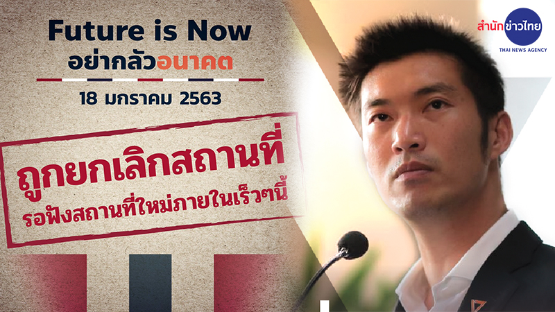 นายธนาธร จึงรุ่งเรืองกิจ หัวหน้าพรรคอนาคตใหม่ โพสต์ข้อความผ่านเฟซบุ๊ก Thanathorn Juangroongruangkit ว่า พรรคอนาคตใหม่ถูกยกเลิกสถานที่จัดงาน “Future is Now : อย่ากลัวอนาคต” ที่ Thailand eSports Arena : เดอะสตรีท รัชดา ในวันเสาร์ที่ 18 ม.ค.นี้ พร้อมระบุกำลังพยายามจัดหาสถานที่จัดงานใหม่ และเชิญชวนประชาชนเสนอไอเดียสถานที่จัดงานใหม่