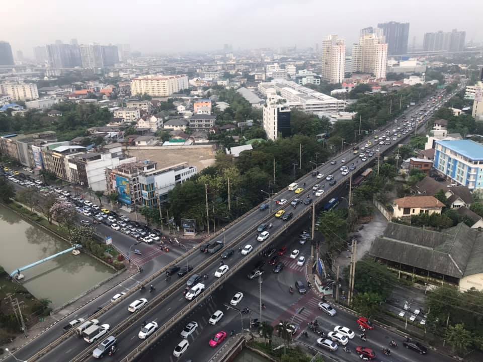ถนนวิภาวดี-รังสิต ขาเข้า ผ่านหน้าท่าอากาศยานดอนเมือง รถเคลื่อนตัวได้ช้า ท้ายแถวสะสมอยู่ที่ทางลงต่างระดับอนุสรณ์สถาน