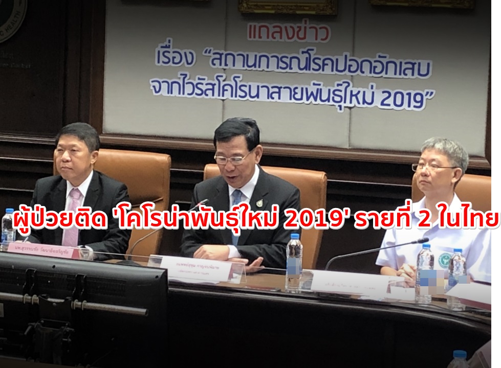 นพ.สุขุม กาญจนพิมาย ปลัดกระทรวงสาธารณสุข (ปลัด สธ.) แถลงข่าว พบผู้ป่วยปอดอักเสบติดเชื้อไวรัสโคโรนาสายพันธุ์ใหม่ 2019 เพิ่มเป็นรายที่ 2 เป็นนักท่องเที่ยวหญิงชาวจีน เดินทางมาจากเมืองอู่ฮั่น เข้าไทยเมื่อวันที่ 13 ม.ค.ที่ผ่านมา มีไข้สูง 38 องศาฯ ตรวจคัดกรองที่สนามบินสุวรรณภูมิ โดยเมื่อพบผู้เข้าเกณฑ์มีไข้สูง มีการติดเชื้อระบบทางเดินหายใจส่วนบน เดินทางมาจากเมืองอู่ฮั่น และผลจากห้องปฏิบัติการณ์ทางวิทยาศาสตร์ยืนยันว่าป่วยทั้ง 2 ห้อง จึงจะทำการประกาศพบผู้ป่วยปอดอักเสบติดเชื้อไวรัสโคโรนาสายพันธุ์ใหม่2019 เพิ่ม ขณะนี้รักษาตัวที่สถาบันบำราศนราดูรอาการดีขึ้น ส่วนผู้ป่วยคนแรก ขณะนี้อาการดีขึ้นจะกลับบ้านได้ใน 1-2 วัน รอเพียงผลการตรวจจากห้องปฏิบัติการ 2 แห่ง ต้องให้ผลเป็นลบ 2 ครั้ง จึงจะปล่อยให้กลับบ้านได้