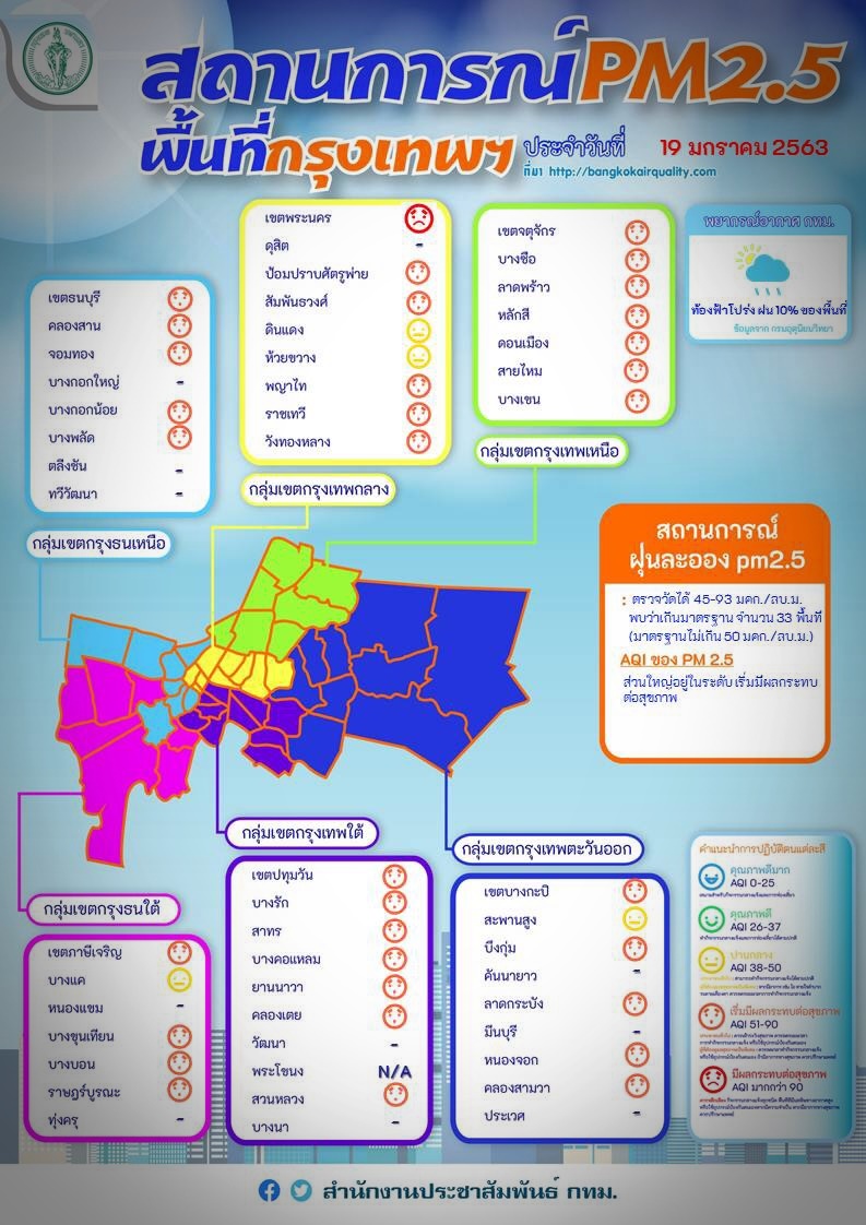 กรุงเทพมหานคร กทม. โดยสำนักสิ่งแวดล้อม รายงานผลการตรวจวัด PM2.5 ณ เวลา 07.00 น.ของวันนี้ (19ม.ค.) ตรวจวัดได้ 45-93 ไมโครกรัม/ลูกบาศก์เมตร (มคก./ลบ.ม.) โดย ค่าPM2.5มีแนวโน้มเพิ่มขึ้น และยังคงมีค่าเกินมาตรฐาน อยู่ในระดับเริ่มมีผลกระทบต่อสุขภาพ พบว่าเกินมาตรฐาน (มาตรฐานไม่เกิน 50 มคก./ลบ.ม.) จำนวน 33 พื้นที่ คือ โดยมีพื้นที่สีแดง ที่มีค่าส่งผลกระทบต่อสุขภาพ มากกว่า90 ไมโครกรัม/ลูกบาศก์เมตร คือเขตพระนคร ตรวจวัดได้ 93 ไมโครกรัม/ลูกบาศก์เมตร