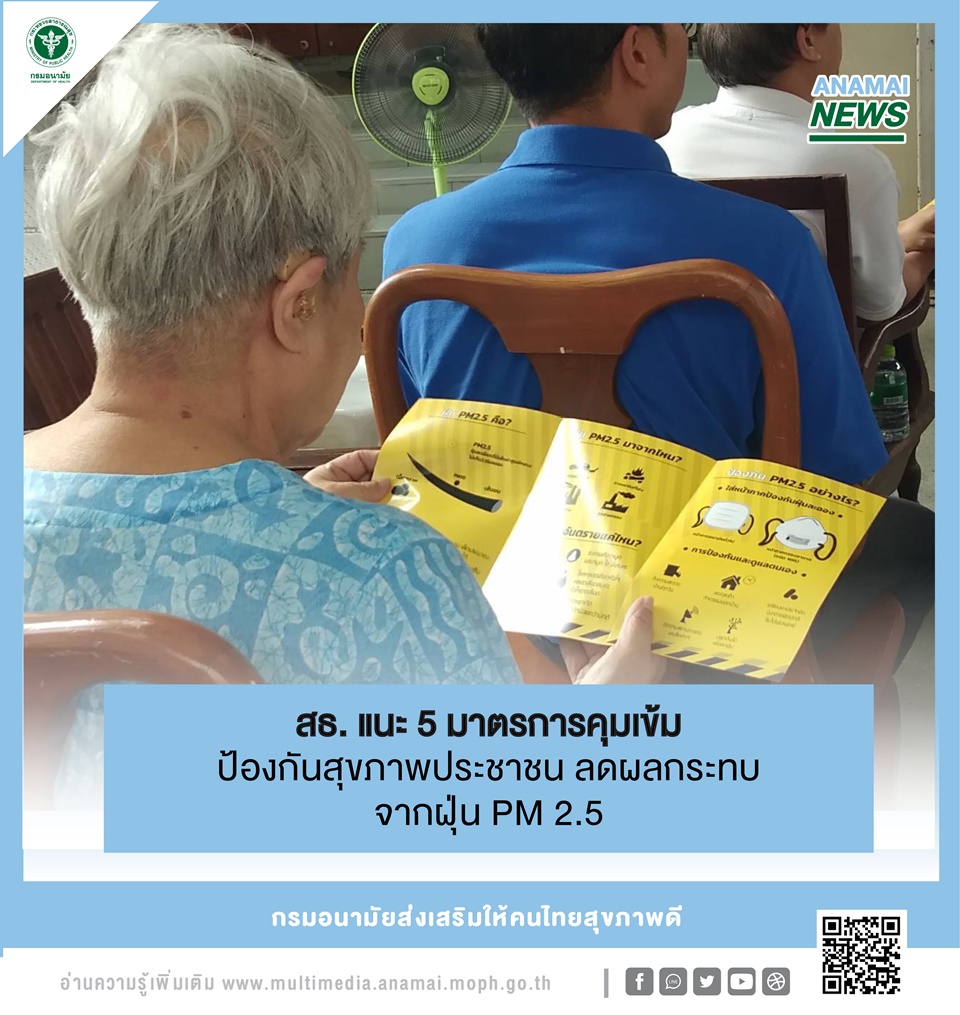 สธ.20 ม.ค.-สธ.เผยยังต้องเฝ้าระวังฝุ่น PM2.5 ต่อเนื่อง คง 5 มาตรการสำคัญ ป้องกันและลดผลกระทบต่อสุขภาพ ย้ำทุกหน่วยงานที่เกี่ยวข้องเฝ้าระวังดูแลสุขภาพประชาชน พร้อมแนะนำการปฏิบัติตน เพื่อป้องกันตนเอง