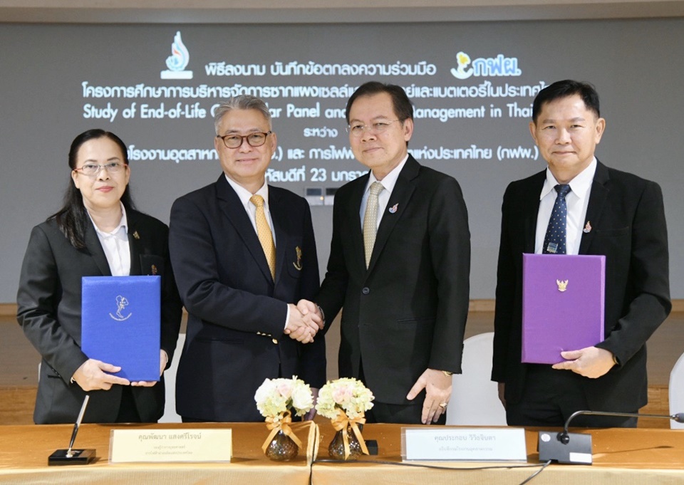 กรมโรงงานอุตสาหกรรม (กรอ.) ลงนามบันทึกข้อตกลงความร่วมมือโครงการศึกษาการบริหารจัดการซากแผงเซลล์แสงอาทิตย์และแบตเตอรี่ในประเทศไทยกับการไฟฟ้าฝ่ายผลิตแห่งประเทศไทย (กฟผ.) แสดงเจตนารมณ์และความมุ่งมั่นในการบูรณาการความร่วมมือบริหารจัดการซากแผงเซลล์แสงอาทิตย์และแบตเตอรี่ที่เกิดจากการใช้งานภายในประเทศ
