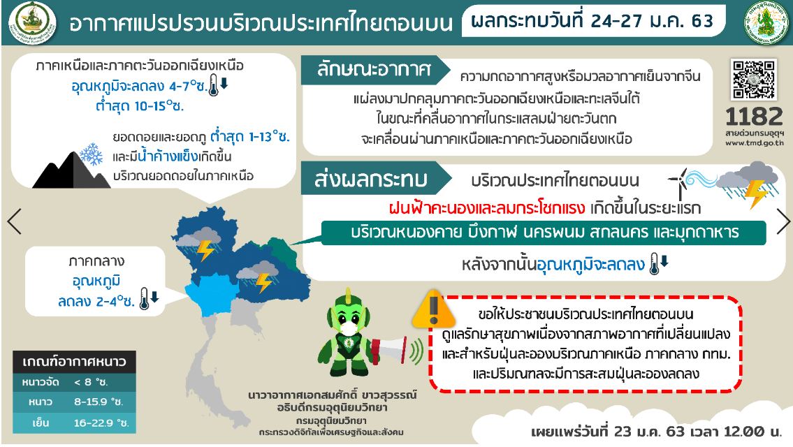 ในช่วงวันที่ 24-27 มกราคม 2563 ประเทศไทยตอนบนจะมีฝนฟ้าคะนองกับลมกระโชกแรงเกิดขึ้นในระยะแรก บริเวณจังหวัดอุดรธานี หนองคาย บึงกาฬ นครพนม สกลนคร และมุกดาหาร หลังจากนั้นวันที่ 26-27 มกราคม 2563 อุณหภูมิจะลดลง โดยภาคเหนือและภาคตะวันออกเฉียงเหนืออุณหภูมิจะลดลง 6-8 องศาเซลเซียส กับมีอากาศหนาว อุณหภูมิต่ำสุด 10-15 องศาเซลเซียส ส่วนยอดดอยและยอดภูมีอากาศหนาวถึงหนาวจัดอุณหภูมิต่ำสุด 1-13 องศาเซลเซียส และมีน้ำค้างแข็งเกิดขึ้นบริเวณยอดดอยในภาคเหนือ