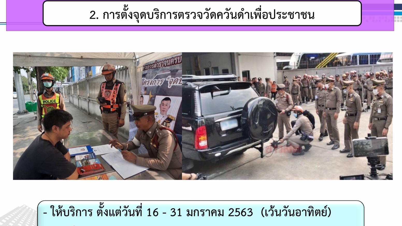 ในส่วนการให้บริการประชาชน กองบังคับการตำรวจจราจร ได้ดำเนินการควบคู่กับการบังคับใช้กฎหมาย โดยมีการตั้งจุดบริการตรวจวัดควันดำเพื่อประชาชน จำนวน 3 จุด กระจายรอบพื้นที่กรุงเทพฯได้แก่ จุดตรวจ สน.คู่ขนานลอยฟ้า ถนนบรมราชชนนี , จุดตรวจ งานช่างเครื่องยนต์/ตรวจพิสูจน์ กองกำกับการ 5 กองบังคับการตำรวจจราจร และ จุดตรวจถนนเทพรัตน์ กม.2 โดยเปิดให้บริการมาตั้งแต่วันที่ 16 ม.ค.36 ระหว่างเวลา 09.00-15.00 น.เว้นวันอาทิตย์ ประชาชนทั่วไปสามารถมาติดต่อขอรับบริการได้ นอกจากนี้ ยังได้ร่วมกับหน่วยงานที่เกี่ยวข้องดำเนินการตรวจวัดมลพิษจากท่อไอเสียรถประจำทาง จำนวนกว่า 1,180 คัน ประสานความร่วมมือกับห้างร้าน สถานประกอบการ ในการช่วยลดปริมาณฝุ่นละอองอีกทางหนึ่ง