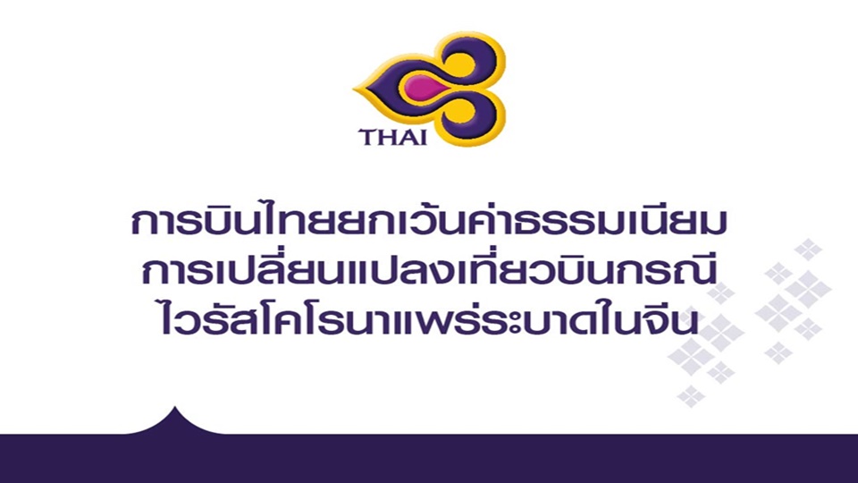 กรุงเทพฯ 26 ม.ค. – การบินไทยยกเว้นค่าธรรมเนียมเปลี่ยนเที่ยวบิน 9 เส้นทาง ไป-กลับจีน หลังไวรัสโคโรนาระบาด