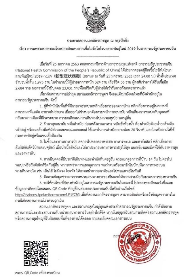 1. ตั้งแต่มีข่าวการแพร่ระบาดของ เชื้อไวรัสโคโรน่าสายพันธุ์ใหม่ 2019 สถานเอกอัครราชทูตไทย ณ กรุงปักกิ่งและสถานกงสุลใหญ่ไทยในจีน ได้ประสานติดต่อกับคนไทยในจีน รวมถึงหน่วยงานที่เกี่ยวข้องของจีน ทั้งในส่วนกลาง และรัฐบาลมณฑลหูเป่ย์ และรัฐบาลนครอู่ฮั่นอย่างใกล้ชิด พร้อมได้แจ้งช่องทางประสานข้อมูลระหว่างกันและช่องทางติดต่อได้ตลอด 24 ชม.
