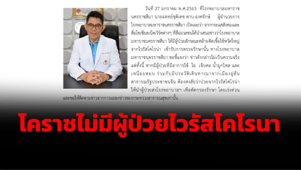 นครราชสีมา 27 ม.ค.- ผอ.รพ.มหาราชนครราชสีมา ห่วงสังคมสับสนข่าวไวรัสโคโรนาสะพัดโซเชียล ย้ำติดตามข้อมูลจากกระทรวงสาธารณสุขเท่านั้น และโรงพยาบาลไม่มีผู้ป่วยติดเชื้อนี้