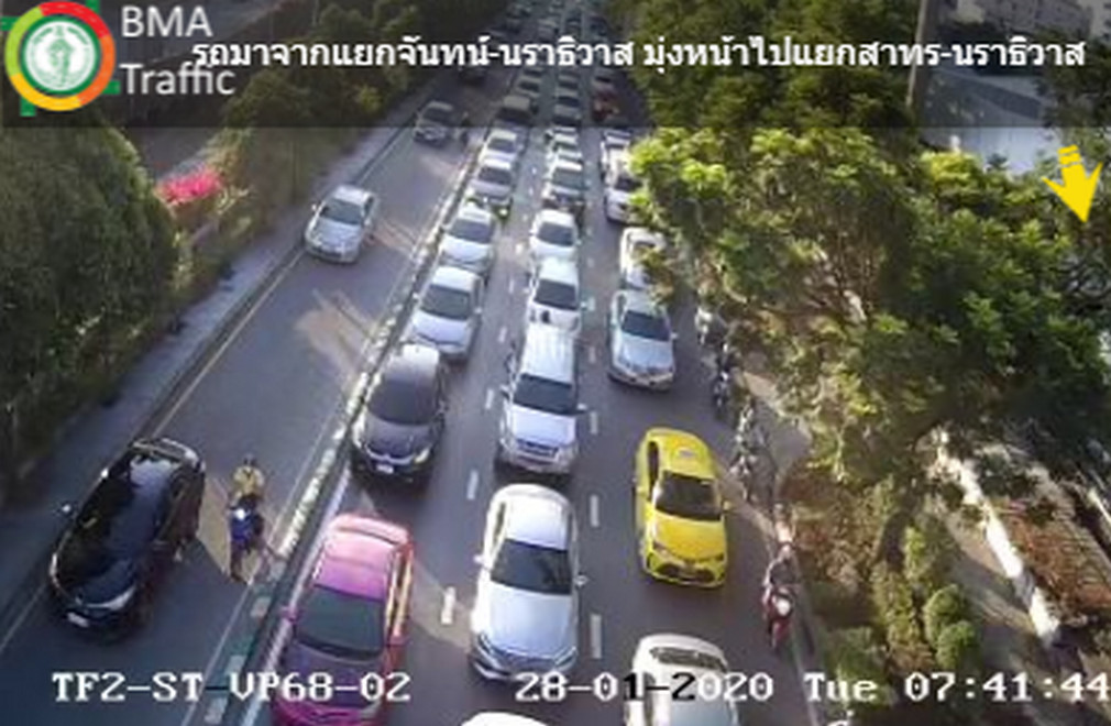 กทม. 28 ม.ค.-สวพ.FM91 รายงานจราจรเช้าวันอังคาร ถนนนราธิวาสราชนครินทร์ ขาเข้า มุ่งหน้าแยกแยกนรินทร รถติดขัดมาก ท้ายแถวสะสมอยู่ที่แยกตัดถนนจันทน์