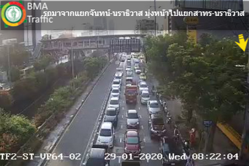 ถนนนราธิวาสราชนครินทร์ จากตัดถนนจันทน์ มุ่งหน้าถนนสาทร รถมาก ท้ายแถวสะสมหน้าแม็คโคร สาทร