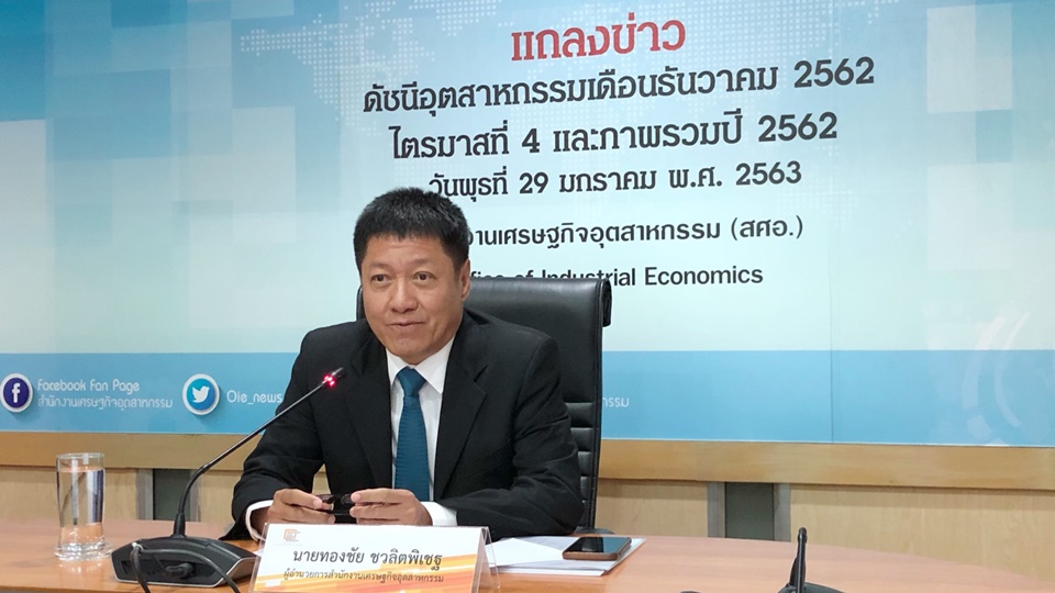 นายทองชัย ยังแถลงดัชนีผลผลิตภาคอุตสาหกรรม (MPI) เดือนธันวาคม 2562 ว่า อยู่ที่ระดับ 99.02 หด ร้อยละ 4.35 เมื่อเทียบกับช่วงเดียวกันปีที่ผ่านมา แต่ดีขึ้นเมื่อเทียบกับเดือนพฤศจิกายน 2562 หดตัวร้อยละ 8.1 ส่งผลให้ภาพรวมดัชนีผลผลิตภาคอุตสาหกรรมตลอดปี 2562 ติดลบร้อยละ 3.7 น้อยกว่าที่คาดการณ์ไว้ว่าจะติดลบร้อยละ 3.8 ตามที่ได้ประมาณการไว้เดือนพฤศจิกายน 2562 ด้านการใช้กำลังการผลิตเดือนธันวาคม 2562 อยู่ที่ร้อยละ 63.96 ปรับตัวเพิ่มขึ้นจากเดือนพฤศจิกายน 2562 ตลอดปี 2562 อัตราการใช้กำลังการผลิตอยู่ที่ร้อยละ 66.3