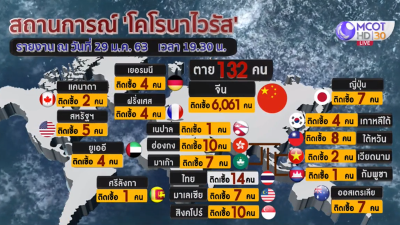 🛑 ภาพรวมสถานการณ์การแพร่ระบาดของไวรัสโคโรนาสายพันธุ์ใหม่ทั่วโลก ณ วันที่ 29 มกราคม 2563 มีผู้ติดเชื้อสูงสุดที่จีน 6,061 ราย เสียชีวิต 132 ราย ไทยยืนยันการติดเชื้อยังอยู่ที่ 14 ราย ในจำนวนนี้สามารถกลับบ้านได้แล้ว 5 ราย