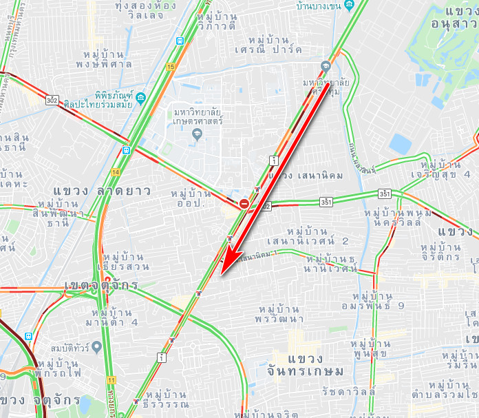กทม. 30 ม.ค.-สวพ.FM91 รายงานจราจรเช้าวันพฤหัสบดี ถนนพหลโยธิน ขาเข้า จากแยกเกษตร มุ่งหน้าแยกเสนานิคม จราจรติดขัด ท้ายแถวสะสมหน้าโรงเรียนสารวิทยา