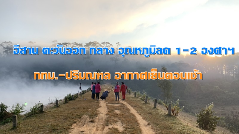 กรมอุตุนิยมวิทยา พยากรณ์อากาศ 24 ชั่วโมงข้างหน้า ภาคเหนือและภาคตะวันออกเฉียงเหนือมีอากาศเย็นถึงหนาว อุณหภูมิต่ำสุด 10-18 องศาเซลเซียส ส่วนภาคกลางและภาคตะวันออกมีอากาศเย็นในตอนเช้า โดยภาคตะวันออกเฉียงเหนือ ภาคตะวันออก และภาคกลาง อุณหภูมิลดลง 1-2 องศาเซลเซียส สำหรับยอดดอยและยอดภูมีอากาศหนาวถึงหนาวจัดกับมีน้ำค้างแข็งบางพื้นที่ อุณหภูมิต่ำสุด 2-11 องศาเซลเซียส ในตอนกลางวันท้องฟ้าโปร่งกับมีแสงแดดจัด ขอให้ประชาชนบริเวณประเทศไทยตอนบนดูแลสุขภาพเนื่องจากสภาพอากาศที่หนาวเย็นไว้ด้วย สำหรับภาคใต้มีฝนฟ้าคะนองบางแห่ง
