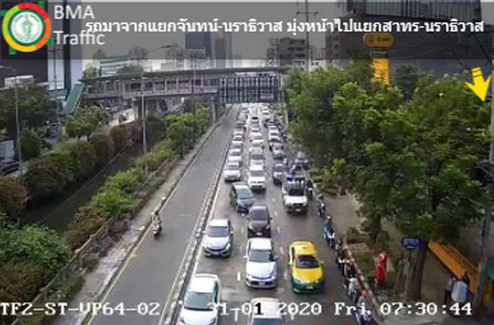 กทม. 31 ม.ค.-สวพ.FM91 รายงานจราจรเช้าวันศุกร์ ถนนนราธิวาสราชนครินทร์ ขาเข้า มุ่งหน้าถนนสาทร รถมาก ท้ายแถวสะสมหน้าแม็คโคร สาทร