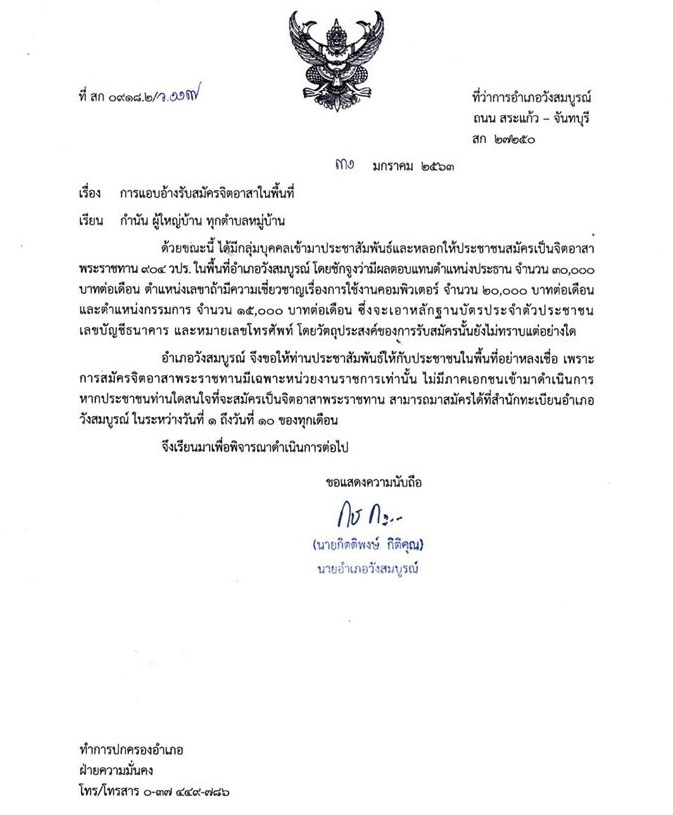 นายกิตติพงษ์ กิติคุณ นายอำเภอวังสมบูรณ์ จ.สระแก้ว ออกหนังสือถึงกำนันผู้ใหญ่บ้านทุกตำบล/หมู่บ้าน เพื่อแจ้งเตือนประชาชนแต่ละพื้นที่อย่าหลงเชื่อบุคคลแอบอ้าง เนื่องจากขณะนี้มีกลุ่มคนเข้ามาหลอกลวงในพื้นที่เพื่อให้สมัครเป็นจิตอาสา โดยชักจูงว่ามีผลตอบแทน จากนั้นจะขอหลักฐานบัตรประจำตัวประชาชน เลขบัญชีธนาคาร และหมายเลขโทรศัพท์ เพื่อไปดำเนินการสมัครตามที่อ้างไว้