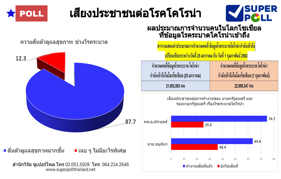 ส่วนผลการสำรวจประมาณการ “เสียงประชาชนในโลกโซเชียล” (Social Media Voice) ผ่านระบบ Net Super Poll เกี่ยวกับโรคระบาดโคโรนา พบว่า มีจำนวนคนที่ข้อมูลโรคระบาดโคโรนาเข้าถึงในโลกโซเชียลเพิ่มขึ้นจาก 21,602,083 คนหรือประมาณ 21 ล้านกว่าคนในวันที่ 25 มกราคม สูงขึ้นมาอยู่ที่ 22,998,547 คน หรือเกือบ 23 ล้านคนในวันที่ 1 กุมภาพันธ์ที่ผ่านมา