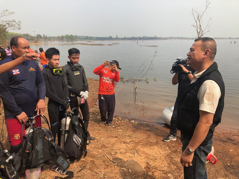 หนองคาย 4 ก.พ.- ตำรวจหนองคายนำชุดประดาน้ำกู้ภัยค้นหาหลักฐานเพิ่มอ่างเก็บน้ำ หลังพบ จยย.-หมวกกันน็อค เร่งสางคดียิงกำนันหญิงตำบลผาตั้งเสียชีวิตในบ้าน