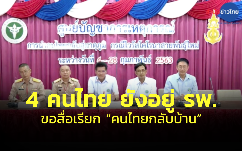 ศูนย์บัญชาการเหตุการณ์การนำคนไทยกลับสู่มาตุภูมิ กรณีไวรัสโคโรนาสายพันธ์ุใหม่ สรุปยอดคนไทยหลังหลับอู่ฮั่นในความดูแลเช้านี้ 134 คน เรียบร้อยดี และ 4 คนอยู่ รพ.สมเด็จพระนางเจ้าสิริกิติ์ กรมแพทย์ทหารเรือ (ปอดผิดปกติเล็กน้อย) รวม 138 คน พร้อมเตรียมปฐมนิเทศเพื่ออธิบายการอยู่ร่วมกัน มุ่ความปลอดภัยญาติพี่น้องและคนไทยทั้งหมดส่วนอาการ 4 คนอยู่ รพ.สิริกิติ์ เช้านี้ไม่มีไข้ ขอติดตามให้แน่ใจ ดูซ้ำอีกที ส่วนทีมนักบิน เจ้าหน้าที่ 16 คนเรียบร้อยดี โดยเป็นแพทย์พยาบาล 9 คน ลูกเรือ 7 คนใส่ชุดป้องกันทั้งขาไป-กลับสมบูรณ์ 100% ปลอดเชื้อ