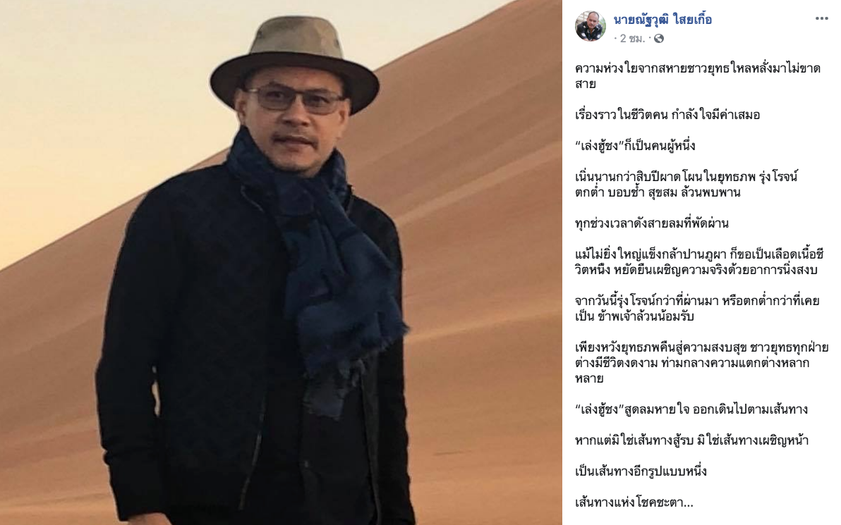 นายณัฐวุฒิ ใสยเกื้อ แกนนำ นปช. โพสต์เฟซบุ๊กส่วนตัวถึงกรณีที่ศาลนัดอ่านคำพิพากษาศาลฎีกา คดีชุมนุมปิดล้อมบ้านพักสี่เสาเทเวศร์ ของ พล.อ.เปรม ติณสูลานนท์ อดีตประธานองคมนตรีและรัฐบุรุษ เมื่อปี 2550 ว่า ความห่วงใยจากสหายชาวยุทธไหลหลั่งมาไม่ขาดสาย เรื่องราวในชีวิตคน กำลังใจมีค่าเสมอ “เล่งฮู้ชง” ก็เป็นคนผู้หนึ่ง เนิ่นนานกว่าสิบปีผาดโผนในยุทธภพ รุ่งโรจน์ ตกต่ำ บอบช้ำ สุขสม ล้วนพบพาน ทุกช่วงเวลาดังสายลมที่พัดผ่าน แม้ไม่ยิ่งใหญ่ แข็งกล้าปานภูผา ก็ขอเป็นเลือดเนื้อชีวิตหนึ่ง หยัดยืนเผชิญความจริงด้วยอาการนิ่งสงบ จากวันนี้รุ่งโรจน์กว่าที่ผ่านมา หรือตกต่ำกว่าที่เคยเป็น ข้าพเจ้าล้วนน้อมรับ เพียงหวังยุทธภพคืนสู่ความสงบสุข ชาวยุทธทุกฝ่ายต่างมีชีวิตงดงาม ท่ามกลางความแตกต่างหลากหลาย “เล่งฮู้ชง” สูดลมหายใจ ออกเดินไปตามเส้นทาง หากแต่มิใช่เส้นทางสู้รบ มิใช่เส้นทางเผชิญหน้า เป็นเส้นทางอีกรูปแบบหนึ่ง เส้นทางแห่งโชคชะตา.-สำนักข่าวไทย
