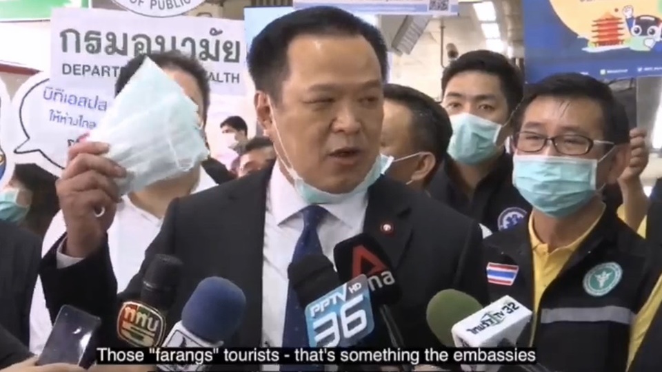 “ส่วนนักท่องเที่ยวชาวต่างชาติ อันนี้ต้องบอกไปยังสถานทูต ให้แจกว่าเมื่ออยู่ในพื้นที่สาธารณะต้องใส่ และแจกแล้วไม่ยอมรับ แบบนี้ต้องไล่ออกจากประเทศไทย ไม่ใช่ไปสนใจคนที่ภาพรวม แค่คนที่อยู่ในประเทศไทย นักท่องเที่ยว เมื่อนำไปให้แล้วยังปฏิเสธอยู่ ไม่มีท่าทีที่ยี่หระต่อสถานการณ์ คนจีน เอเชีย รับทุกคน รับหมด แต่พวกยุโรปนี่น่านัก รู้ได้ไงว่าตัวเองจะไม่เป็นการแพร่เชื้อ เพราะอาจจะเป็น ไปเที่ยวเมืองอื่นก่อนมาเมืองไทยก็ได้ ซึ่งเป็นสิ่งที่คนไทยต้องช่วยกันในการป้องกันไวรัสโคโรนาที่กำลังแพร่ระบาดอยู่ในขณะนี้” นายอนุทิน กล่าว.-สำนักข่าวไทย