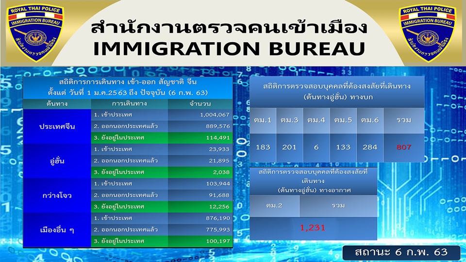 ขณะที่บุคคลที่เดินทางมาจากเมืองอื่นๆ ของประเทศจีนเข้ามาในไทย 876,190 คน ออกไปแล้ว 775,993 คน เหลืออยู่ 100,197 คน นอกจากนั้นสำนักงานตรวจคนเข้าเมือง ยังได้ตรวจสอบบุคคลต้องสงสัยที่เดินทางมาจากเมืองอู่ฮั่นเพื่อคัดกรองผู้ติดเชื้อไวรัสโคโรนา สายพันธุ์ใหม่ทางท่าอากาศยานจำนวน 1,231 คน และทางด่านตรวจคนเข้าเมืองทั่วประเทศรวม 807 คน