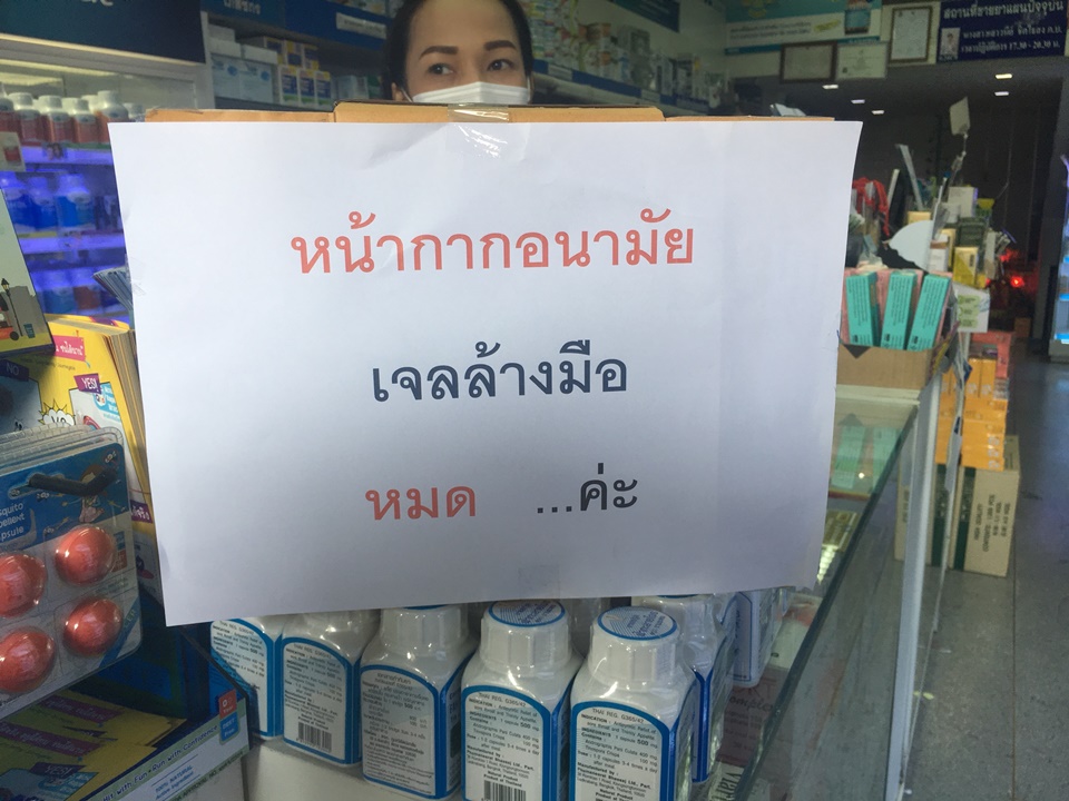 ร้านแรก ชื่อร้าน”ยาหนึ่ง” ไม่ต้องถามอะไรกันเลยเพราะมีป้ายติดหน้าร้าน-ในร้านชัดเจน ว่า “หน้ากากอนามัย เจลล้างมือ หมด” สอบถามพนักงานในร้านก็บอกว่า ตั้งแต่มีการแพร่ระบาดของเชื้อไวรัสโคโรนา ประชาชนตื่นตัวมาหาซื้อหน้ากากอนามัยและเจลล้างมือต่อเนื่องทุกวัน ซื้อครั้งละหลายชิ้น จนทำให้สินค้าที่เคยคิดว่าสั่งมาเยอะ ครั้งละหลายร้อยกล่อง หรือเกือบหมื่นชิ้นที่สต๊อคไว้หมดไปตั้งแต่ปลายเดือนมกราคม ร้านก็พยายามสั่งแต่ต้นทางบอกว่าไม่มีของ ไม่เข้าใจว่าขนาดสั่งจากต้นทางหน้าโรงงานก็ยังไม่มีของ ส่วนราคาทางร้านยืนยันขายราคาเดิม กล่องหนึ่งมี 50 ชิ้น ราคาขายประมาณ 100 บาท แต่ช่วงที่ผ่านมาความต้องการสูงก็มีบางร้านฉวยโอกาสขึ้นราคาสูงกว่าเดิม 5 เท่า ที่ทราบเพราะมีลูกค้ามาบอกให้ฟัง