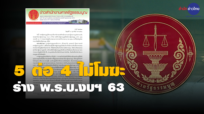 ศาลรัฐธรรมนูญ 7 ก.พ.- ศาลรัฐธรรมนูญอ่านคำวินิจฉัย กรณีประธานสภาผู้แทนราษฎรส่งความเห็นของ ส.ส. ขอให้ศาลรัฐธรรมนูญวินิจฉัยตามมาตรา 148 วรรคหนึ่ง (1) ว่า ร่าง พ.ร.บ.งบประมาณรายจ่ายประจำปีงบประมาณ พ.ศ. 2563 วงเงิน 3.2 ล้านล้านบาท ตราขึ้นโดยไม่ถูกต้องตามบทบัญญัติแห่งรัฐธรรมนูญหรือไม่ โดยศาลได้มีมติเสียงข้างมาก 5 ต่อ 4 เห็นว่า ร่าง พ.ร.บ.งบประมาณฯปี 2563 ไม่ขัดต่อรัฐธรรมนูญ ให้สภาผู้แทนราษฎรกลับไปโหวตวาระ 2-3 ใหม่ .-สำนักข่าวไทย