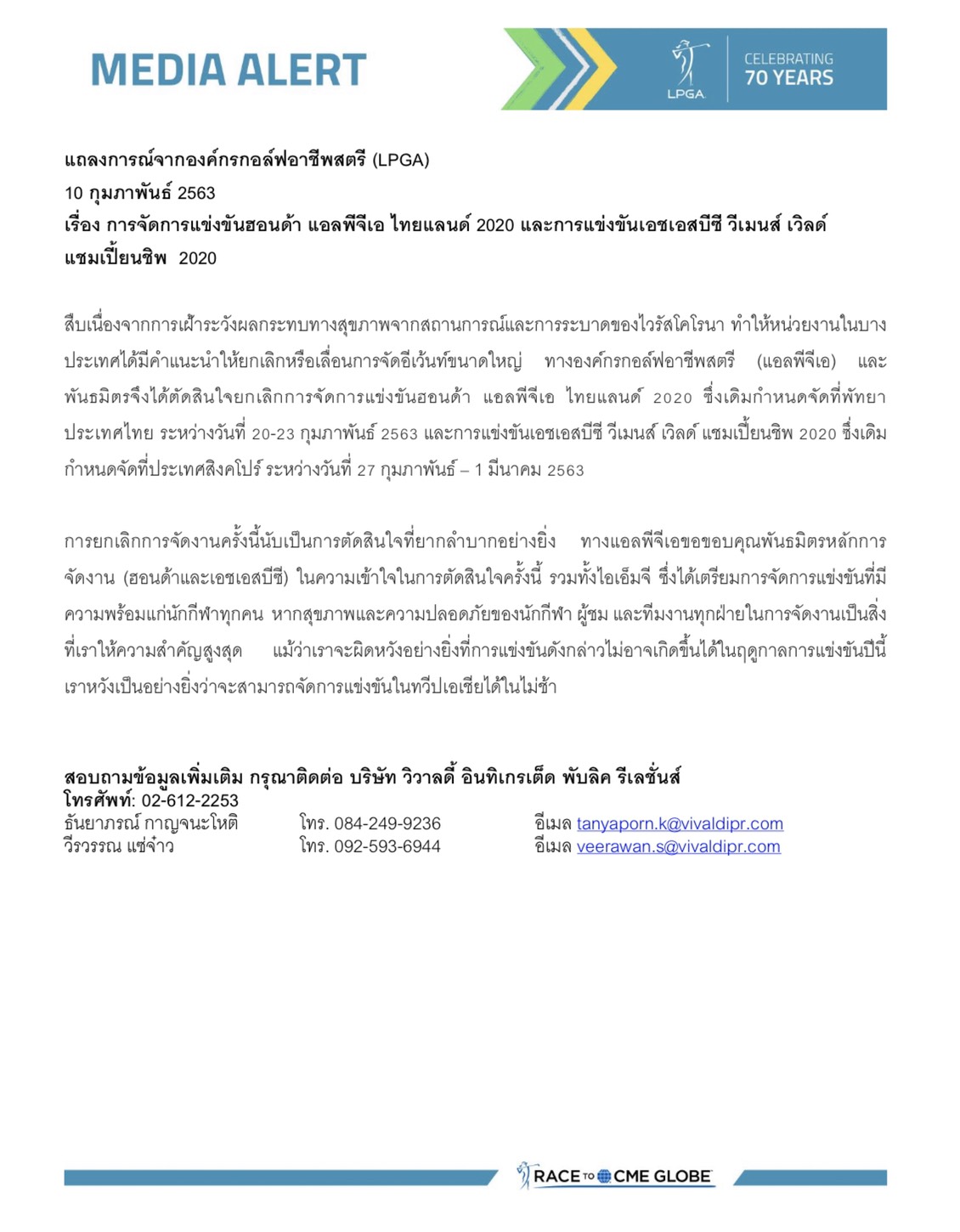 และพันธมิตรจึงได้ตัดสินใจยกเลิกการจัดการแข่งขันฮอนด้า แอลพีจีเอ ไทยแลนด์ 2020