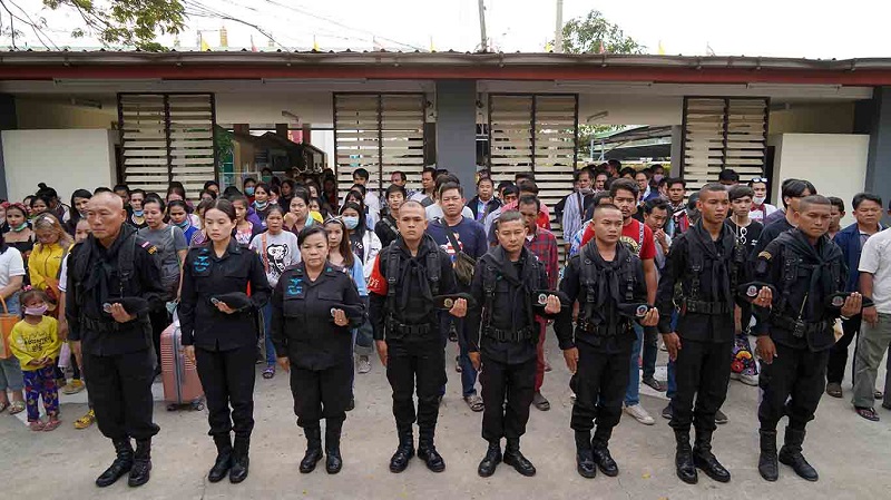 บรรยากาศเช้านี้ (11 ก.พ.) บริเวณด้านหน้ากองร้อยทหารพรานที่ 1201 ด่านผ่านแดนถาวรบ้านคลองลึก อ.อรัญประเทศ จ.สระแก้ว พ.ต.ชาญ ว่องไวเมธี ผู้บังคับกองร้อยทหารพรานที่ 1201 พร้อมกำลังทหารพราน รวมทั้งประชาชนทั้งชาวไทย และชาวกัมพูชาที่เดินทางข้ามแดนเข้ามาทำงานฝั่งไทย รวมทั้งประกอบอาชีพค้าขายในตลาดโรงเกลือนับพันคน ร่วมกันยืนสงบนิ่งเป็นเวลา 1 นาที เพื่อแสดงความไว้อาลัยให้กับผู้ประสบเหตุรุนแรงจากการกราดยิงของ จ.ส.อ.จักรพันธ์ ถมมา ที่จังหวัดนครราชสีมา เมื่อวันที่ 8-9 ก.พ.ที่ผ่านมา ทำให้ประชาชนและเจ้าหน้าที่เสียชีวิตถึง 30 ราย บาดเจ็บอีกกว่า 50 ราย.-สำนักข่าวไทย