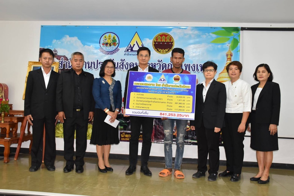 จากเหตุการณ์ดังกล่าว ม.ร.ว.จัตุมงคล โสณกุล รัฐมนตรีว่าการกระทรวงแรงงาน มอบหมายให้ รศ.ดร.จักษ์ พันธ์ชูเพชร ที่ปรึกษารัฐมนตรีว่าการกระทรวงแรงงานลงพื้นที่ โดยนายทศพล กฤตวงศ์วิมาน เลขาธิการสำนักงานประกันสังคม มอบหมายนายบุญสงค์ ทัพชัยยุทธ ผู้ตรวจราชการกรม สำนักงานประกันสังคม ลงพื้นที่พร้อมด้วยนางรัชนี ภู่พร้อมพันธุ์ ประกันสังคมจังหวัดกำแพงเพชร มอบเงินทดแทนกรณีเสียชีวิตเนื่องจากการทำงานให้นายจ้างแก่ทายาทนาย YE KO HTET รวมเป็นเงินทั้งสิ้นจำนวน 841,253.25 บาท