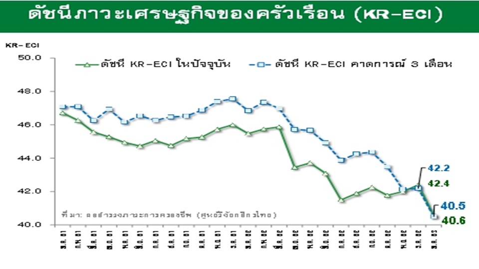 ขณะที่ดัชนีภาวะเศรษฐกิจและการครองชีพของครัวเรือนในอีก 3 เดือนข้างหน้า อยู่ที่ระดับ 40.5 ในการสำรวจช่วงเดือนธันวาคม 2562 ทรุดลงจากเดือนก่อนหน้าที่อยู่ระดับ 42.2 โดยครัวเรือนมีความกังวลมากขึ้นต่อภาวะเศรษฐกิจและการครองชีพของตนเองในช่วง 3 เดือนข้างหน้า (ก.พ.-เม.ย.) โดยเฉพาะราคาสินค้าและบริการในประเทศที่ครัวเรือนมองว่าจะปรับตัวสูงขึ้นต่อเนื่องในระยะข้างหน้า หลังการระบาดไวรัสโคโรนาสายพันธุ์ใหม่หรือโควิด-19