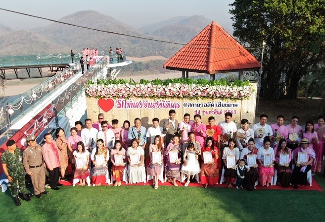 The Loei governor presided over the ceremony and handed registered marriage certificates to participating couples. The 80-meter-high glass skywalk is a new tourist attraction of Loei and was set for official opening in April. (TNA)