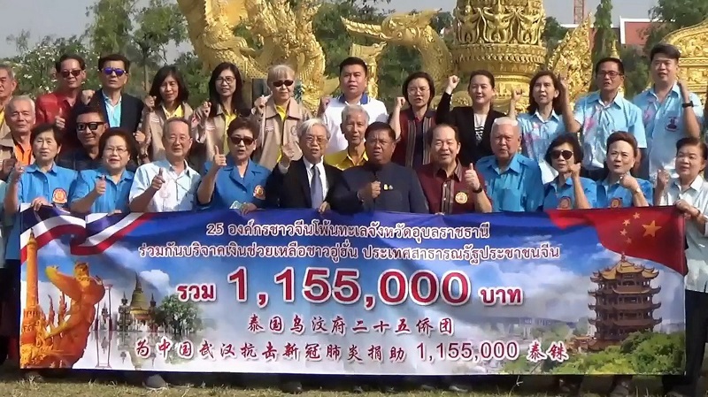 วันนี้ (14 ก.พ.) ที่ลานเทียนเฉลิมพระเกียรติ สวนสาธารณะทุ่งศรีเมือง อ.เมือง จ.อุบลราชธานี ตัวแทนจาก 24 องค์กรชาวไทยโพ้นทะเลหรือคนไทยเชื้อสายจีนที่อาศัยอยู่ใน จ.อุบลราชธานี กว่า 30 คน นำเงินที่องค์กรที่ได้รับจากการสมทบทุน อาทิ สภาอุตสาหกรรมจังหวัด หอการค้าจังหวัด กลุ่มตระกูลแซ่ต่าง ๆ จำนวน 1,155,000 บาท มอบผ่านนายสฤษดิ์ วิฑูรย์ ผู้ว่าราชการจังหวัดอุบลราชธานี เพื่อมอบให้กงสุลจีนที่จังหวัดขอนแก่น นำไปดำเนินการกับโรคไวรัสโคโรนา หรือ โควิด-19 กำลังระบาดในจีน