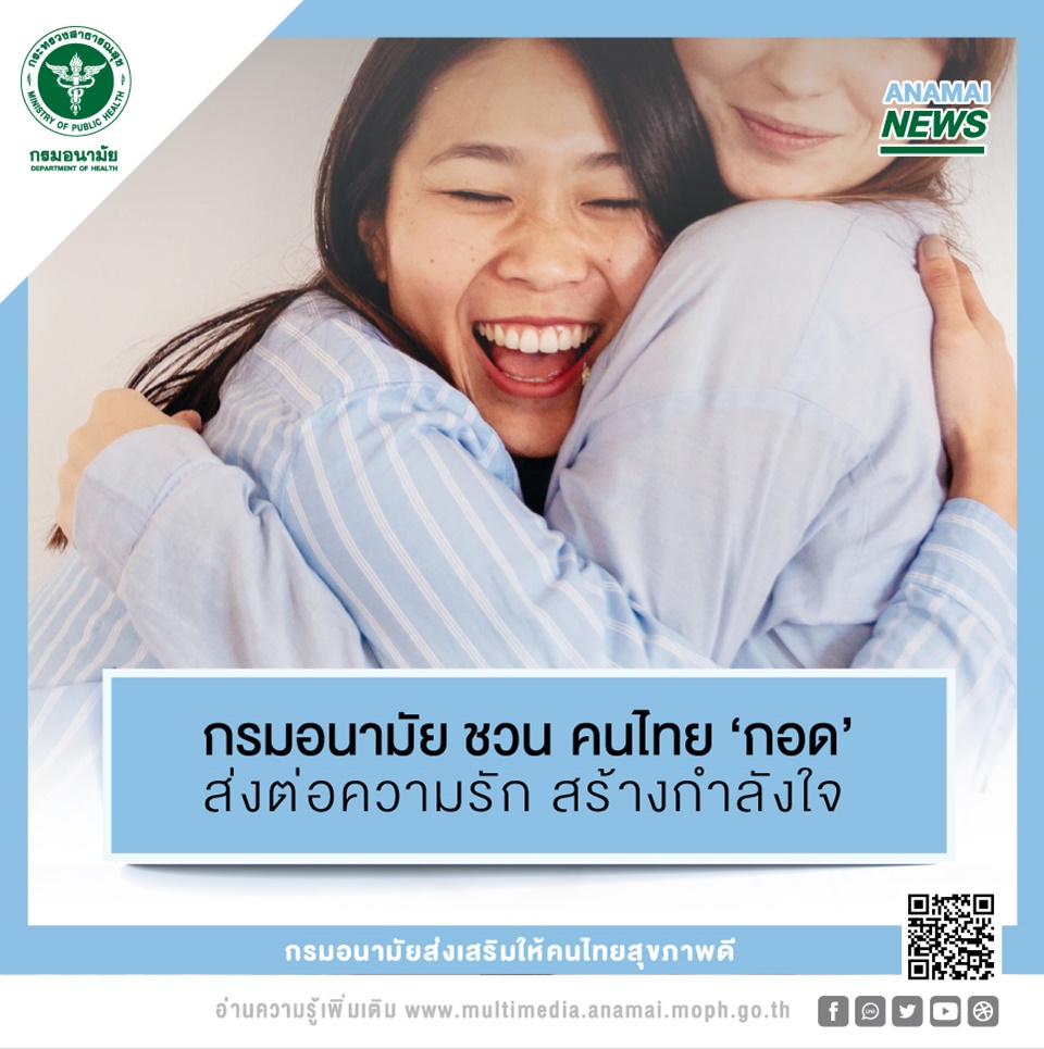 กรมอนามัย 14 ก.พ.-กรมอนามัย ชวนคนไทยถ่ายทอดความรัก สร้างกำลังใจ ให้กับคนในครอบครัว เพื่อน และคนรักในทุก ๆ วัน ด้วยการ “กอด” กระตุ้นความรู้สึกดี ๆ ช่วยเยียวยาจิตใจให้กับผู้สูงอายุ