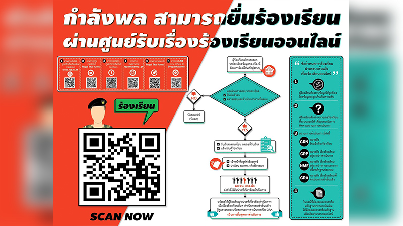 ทั้งนี้ กำลังพลกองทัพบกสามารถยื่นเรื่องร้องเรียนผ่านศูนย์รับเรื่องร้องเรียนออนไลน์ผ่านช่องทางต่าง ๆ ได้แก่ 1. เว็บไซด์ศูนย์รับเรื่องร้องเรียนกองทัพบก www.rta.mi.th 2. youtube กองทัพบก Royal Thai Army 3. facebook ศูนย์ประชาสัมพันธ์กองทัพบก 4. Instragram royalthaiarmy_pr 5.ทวิตเตอร์ Royal Thai Army 6. line official id : @royalthaiarmy และสายตรงผู้บัญชาการทหารบกสามารถติดต่อได้ทางหมายเลข 02-0187330