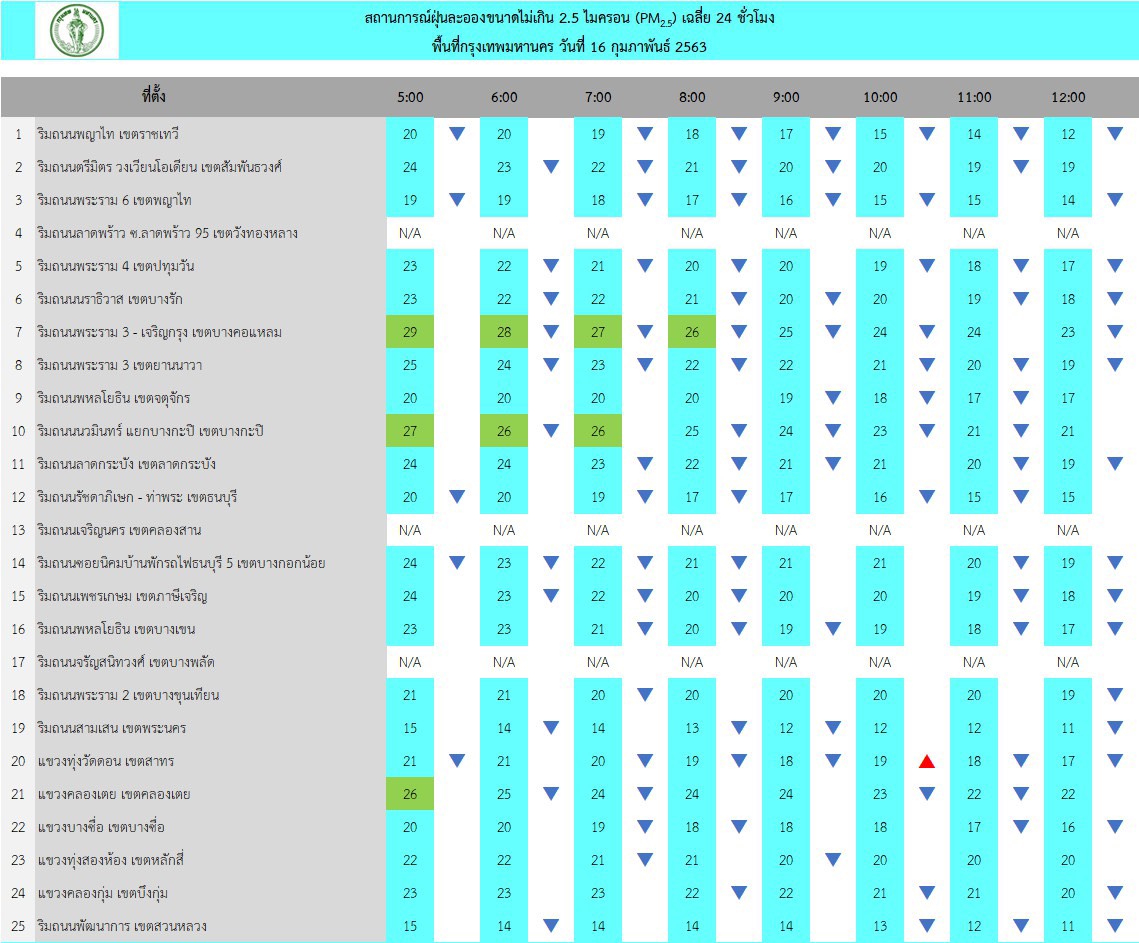 กทม.16 ก.พ..-กรุงเทพมหานครเผยผลตรวจวัด PM2.5 เวลา 10.00-12.00 น. ตรวจวัดได้ 10-24 มคก./ลบ.ม. ค่าเฉลี่ย 17 มคก./ลบ.ม. ค่า PM2.5 มีแนวโน้มลดลงและอยู่ในเกณฑ์มาตรฐานทุกสถานีที่มีการตรวจวัด ดัชนีคุณภาพอากาศส่วนใหญ่อยู่ในระดับคุณภาพดีมาก-ดี สามารถทำกิจกรรมกลางแจ้งและการท่องเที่ยวได้ตามปกติ กรมอุตุนิยมวิทยา พยากรณ์สภาพอากาศในพื้นที่กรุงเทพมหานคร ท้องฟ้าโปร่ง