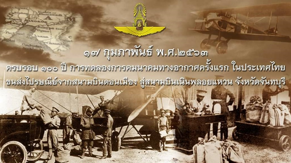 กรุงเทพฯ 17 ก.พ.-กองทัพอากาศ จัดอากาศยานขึ้นทำการบินจำลองสถานการณ์การนำส่งไปรษณีย์ทางอากาศครั้งแรก ในเส้นทางย้อนรอยประวัติศาสตร์ สนามบินดอนเมือง สนามบินเนินพลอยแหวน จังหวัดจันทบุรี เนื่องในโอกาสครบรอบ 100 ปี การทดลองการคมนาคมทางอากาศ