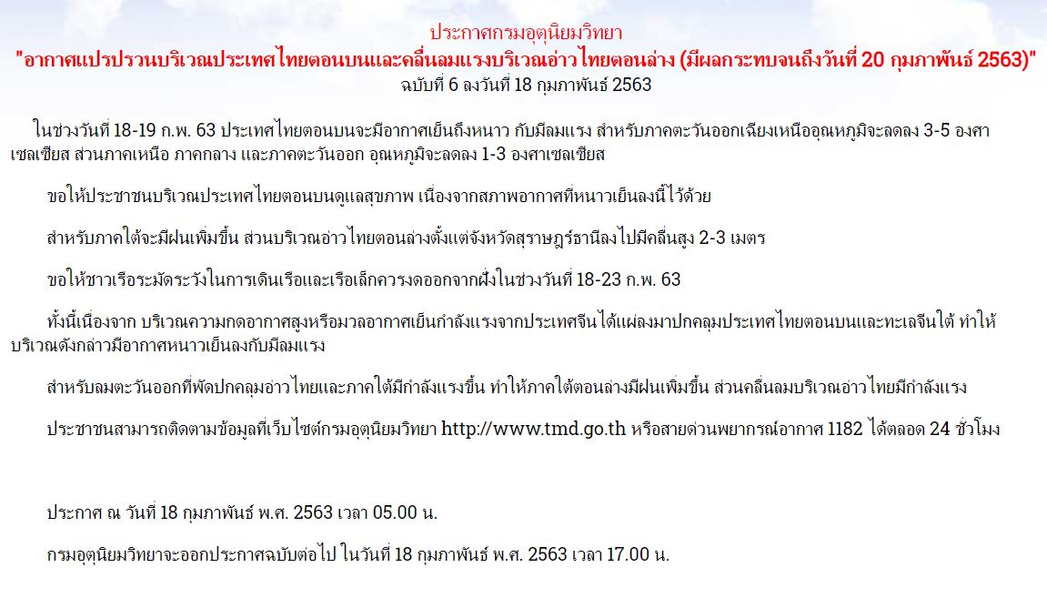 ในช่วงวันที่ 18-19 ก.พ. ประเทศไทยตอนบนจะมีอากาศเย็นถึงหนาว กับมีลมแรง สำหรับภาคตะวันออกเฉียงเหนืออุณหภูมิจะลดลง 3-5 องศาเซลเซียส ส่วนภาคเหนือ ภาคกลาง และภาคตะวันออก อุณหภูมิจะลดลง 1-3 องศาเซลเซียส ขอให้ประชาชนบริเวณประเทศไทยตอนบนดูแลสุขภาพ เนื่องจากสภาพอากาศที่หนาวเย็นลงนี้ไว้ด้วย
