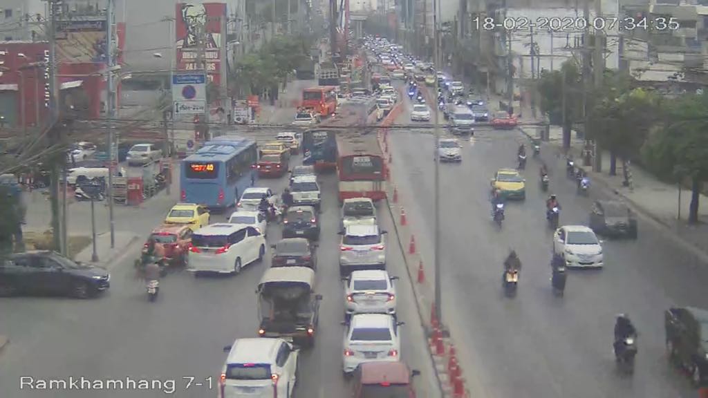 กทม. 18 ก.พ.-สวพ.FM91 รายงานจราจรเช้าวันอังคาร ถนนรามคำแหง ขาออก ผ่านแยกวัดเทพลีลา มุ่งหน้าลำสาลี ติดเบี่ยงแนวก่อสร้างรถไฟฟ้า รถติด ท้ายแถวสะสมหน้าฟู้ดแลนด์ หัวหมาก
