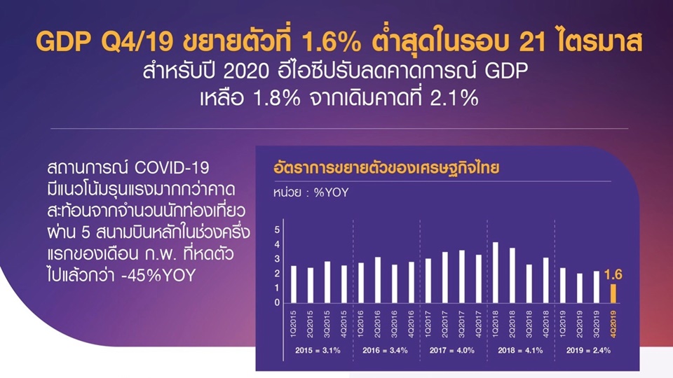 ศูนย์วิจัยเศรษฐกิจและธุรกิจ ธนาคารไทยพาณิชย์ (EIC) ลดคาดการณ์ GDP ปีนี้เหลือโต 1.8% จากเดิม 2.1% เนื่องจากสถานการณ์การแพร่ระบาดของไวรัสโคโรนาสายพันธุ์ใหม่ (COVID-19) มีแนวโน้มรุนแรงและน่าจะส่งผลกระทบต่อเศรษฐกิจไทยมากกว่าที่คาดไว้เดิมผ่านการลดลงของนักท่องเที่ยวต่างชาติ และยังอาจส่งผลต่อการลดลงของการเดินทางท่องเที่ยวและจับจ่ายใช้สอยของคนไทยอีกด้วย อีกทั้งยังมีความเสี่ยงจากเรื่อง Supply chain disruption ที่อาจส่งผลกระทบต่อการชะลอตัวของการส่งออกไทยเพิ่มเติมได้