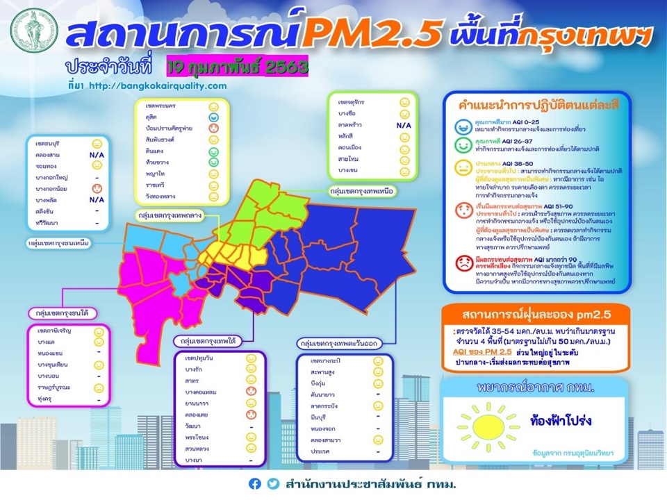 คุณภาพอากาศของกรุงเทพมหานคร ประจำวันพุธที่ 19 กุมภาพันธ์ พ.ศ. 2563 ณ เวลา 07.00 น ค่าเฉลี่ย 24 ชั่วโมงของฝุ่นละอองขนาดไม่เกิน 2.5ไมครอน(PM2.5)ตรวจวัดได้ 35-54 ไมโครกรัม/ลูกบาศก์เมตร (มคก./ลบ.ม.) พบว่าเกินมาตรฐาน (มาตรฐานไม่เกิน 50 มคก./ลบ.ม.) จำนวน 4 พื้นที่ คือ