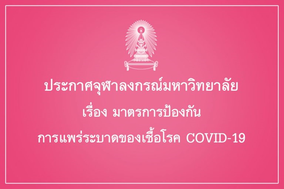 ตามที่มหาวิทยาลัยได้ออกประกาศจุฬาลงกรณ์มหาวิทยาลัย เรื่อง ให้หยุดเรียนหรือหยุดงานในช่วงสถานการณ์โรคติดเชื้อไวรัสโคโรนา ลงวันที่ 27 มกราคม 2563 ไปแล้วนั้น แต่เนื่องจากปรากฏข้อเท็จจริงเป็นที่ประจักษ์ว่า บัดนี้มีผู้ติดเชื้อโรค COVID-19 แล้วเป็นจำนวนมาก และเชื้อโรคดังกล่าวยังได้แพร่ระบาดอย่างรวดเร็วและรุนแรงไปยังหลายประเทศในภูมิภาคต่างๆ ของโลก มหาวิทยาลัยจึงจำเป็นต้องเพิ่มมาตรการป้องกันการแพร่ระบาดของเชื้อโรคดังกล่าว เพื่อมิให้ส่งผลกระทบต่อสุขภาพของนักเรียน นิสิตและบุคลากร ตลอดจนการดำเนินงานของมหาวิทยาลัย