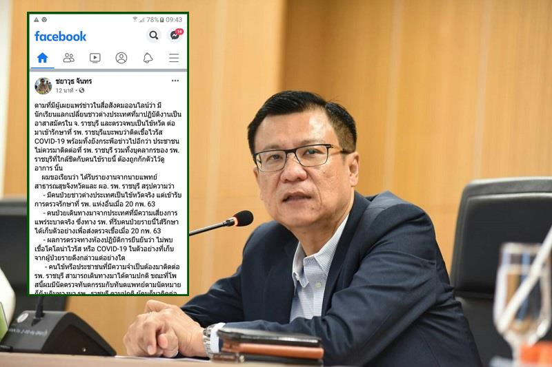 นายชยาวุธ จันทร ผู้ว่าราชการจังหวัดราชบุรี โพสต์เฟซบุ๊กส่วนตัวขอให้ประชาชนไตร่ตรองการรับข่าวสารทางโซเชียลอย่างรอบคอบ เนื่องจากพบว่ามีการแชร์ข้อมูลกันมากกรณีไม่ควรมาติดต่อที่โรงพยาบาลราชบุรี เพราะมีชาวต่างชาติมาปฏิบัติงานเป็นอาสาสมัครในจังหวัดราชบุรีป่วยติดเชื้อโควิด-19 เข้ารักษาตัวอยู่ที่โรงพยาบาล รวมทั้งบุคลากรของโรงพยาบาลที่ใกล้ชิดกับผู้ป่วยรายนี้ต้องถูกกักตัวรอดูอาการว่า นายแพทย์สาธารณสุขจังหวัดและผู้อำนวยการโรงพยาบาลราชบุรีได้รายงานว่า มีผู้ป่วยชาวต่างชาติเป็นไข้หวัดเข้ามารักษาเมื่อวันที่ 20 ก.พ.2563 ทางโรงพยาบาลได้เก็บตัวอย่างส่งตรวจเชื้อ ผลการตรวจทางห้องปฏิบัติการยืนยันชัดเจนไม่พบสารพันธุกรรมของไวรัสโคโรนาสายพันธุ์ใหม่ 2019 (COVID -19) หากประชาชนเจ็บป่วยสามารถมาโรงพยาบาลราชบุรีได้ตามปกติ