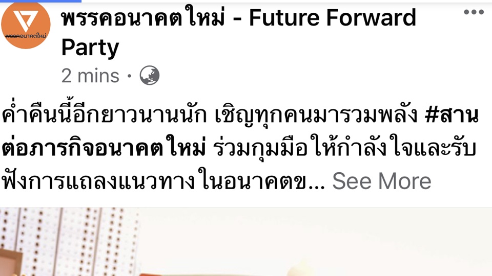 นอกจากนี้ เวลา 16.25 น. เฟสบุ๊คของพรรคอนาคตใหม่ได้เปลี่ยนโปร์ไฟล์รูป โดยขีดฆ่าคำว่า พรรค ออก เหลือเพียงคำว่า อนาคตใหม่ .- สำนักข่าวไทย
