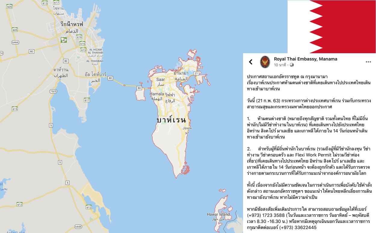 BANGKOK, Feb 22 (TNA) -The Thai embassy in Manama advised Thai citizens to avoid travelling to Bahrain after the authorities in Bahrain announce entry ban to foreigners, who have visited five countries including Thailand.